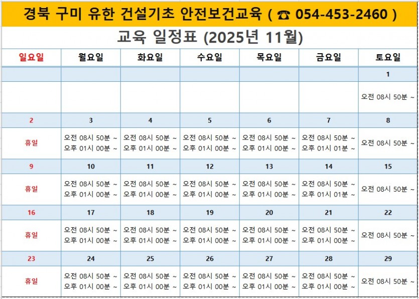 25년 11월 교육일정표 페이지 정보 작성자 최고관리자 댓글 0건 조회 83회 작성일 25-10-27 16:55 목록 2025년 11월 교육일정표 올려드립니다 교육에 참고하세요 다음글25년 10월 교육일정표 25.09.25